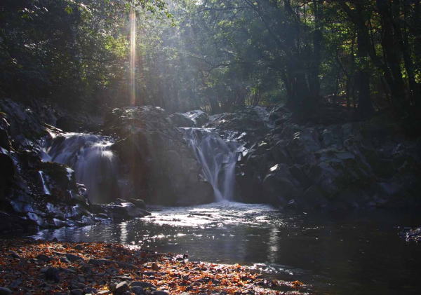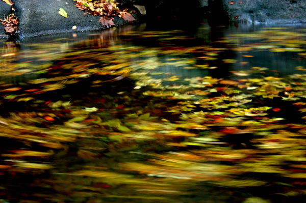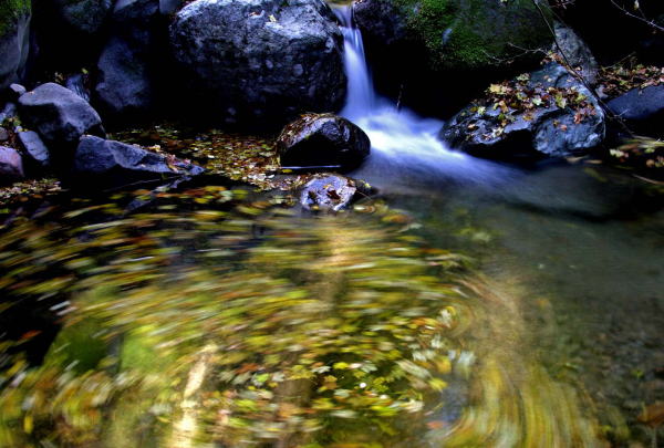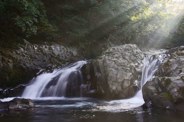 | 川霧に差し込む光線が上手く表現できません。 本来、この滝つぼには紅葉が映ったり、淀んだ場所に落ち葉がぐるぐる回っていたりする筈 でしたが、紅葉には少し早かったようです。 また、好天続きで水量が少ないのも残念でした。 |