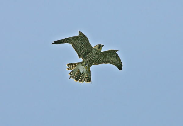 | 母ハヤブサが餌の鳩を見せに来ました。 |