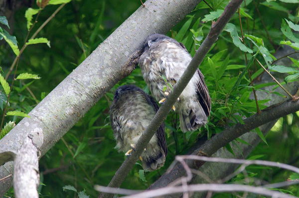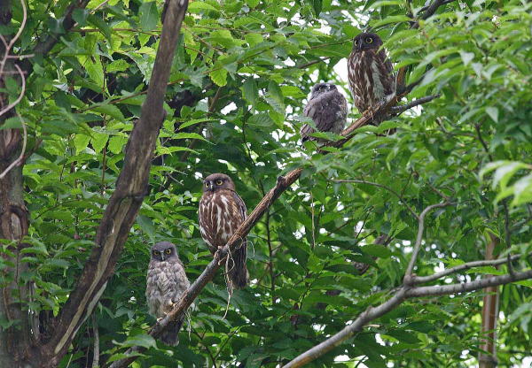 ![]() 居ました。右からお父さん、第一子、お母さん、第二子のようです。第一子を除きお昼寝中。 昨年も4羽が一本の枝に止まっているのは見かけたのですが、もっと高く葉が邪魔な枝で 上手く収める事ができませんでしたが、今年は何とかなりそうです。 MarkIIに400mmでもフレーム一杯です。 |