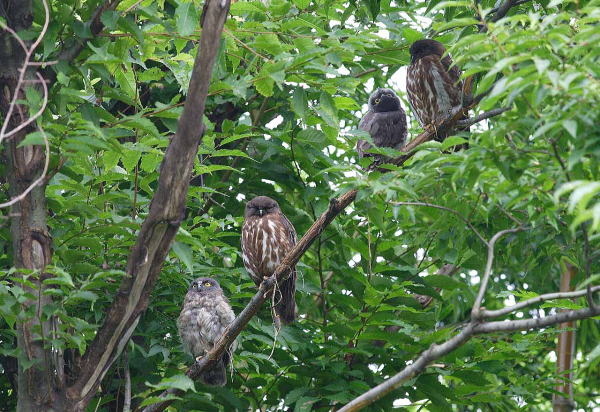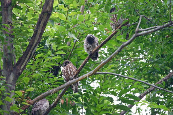 日曜日の夕方、翡翠の幼鳥を撮るつもりでいつものI川に出かけました。 まだアオバズクの一家がいるかも知れないので、先近くのにアオバズクのポイントにカメラを持たずに向かいました。途中でKAICHOさんとばったり遭遇。 今親子4羽が揃っているよ!とのことで、慌てて車に機材を取りに戻りました。