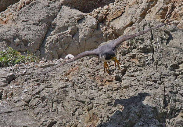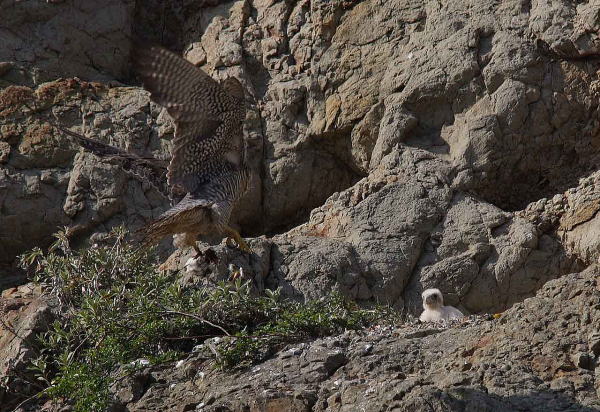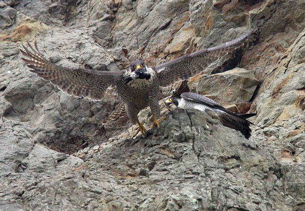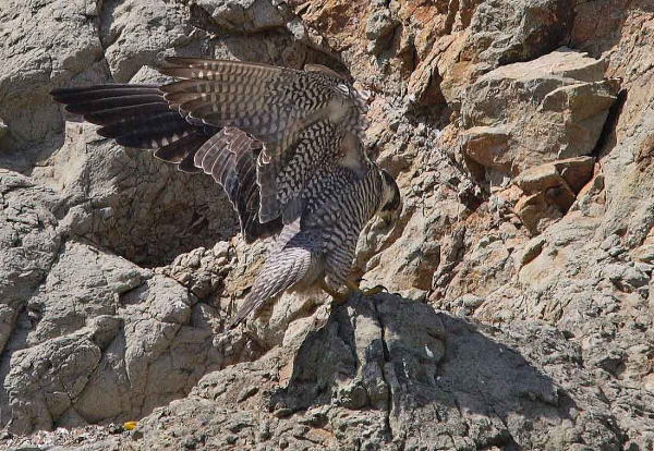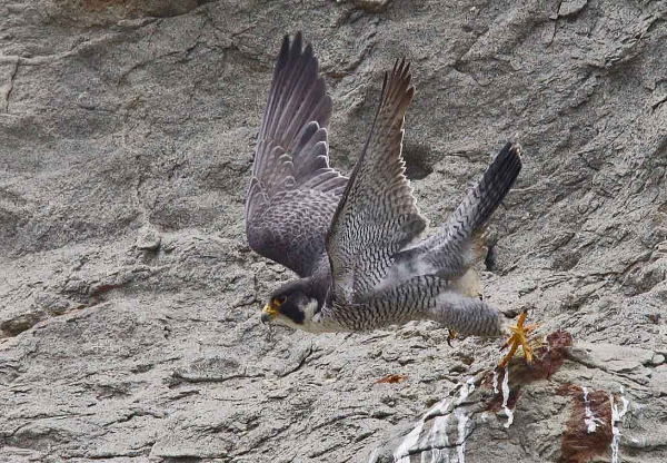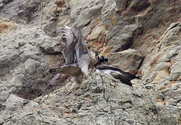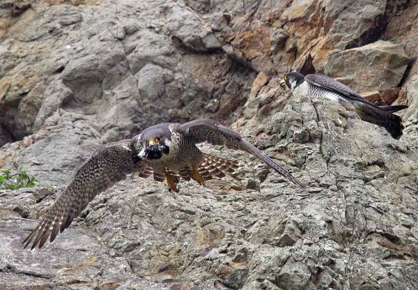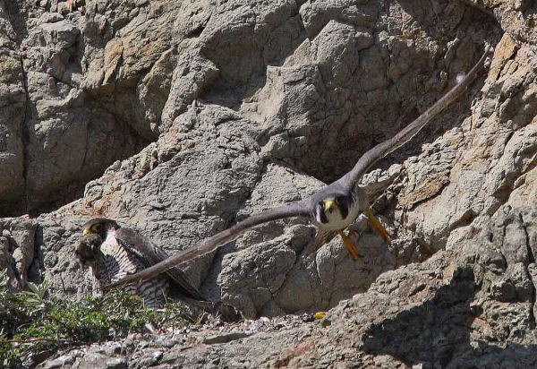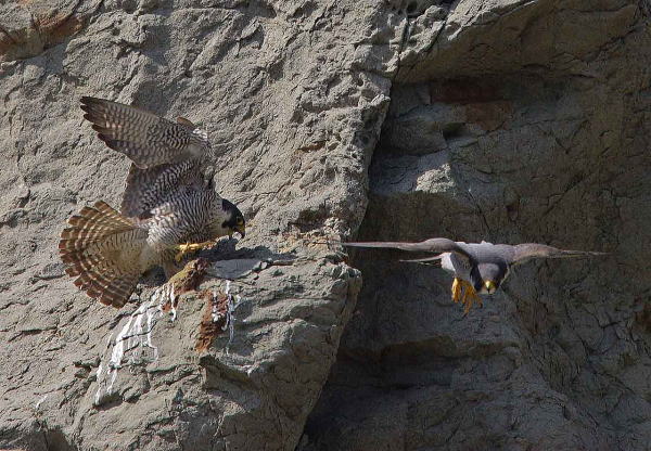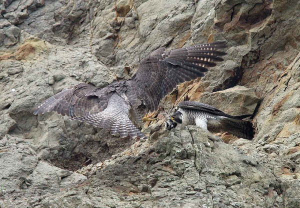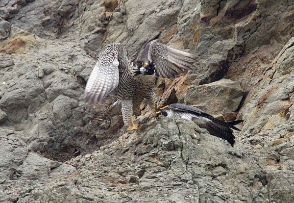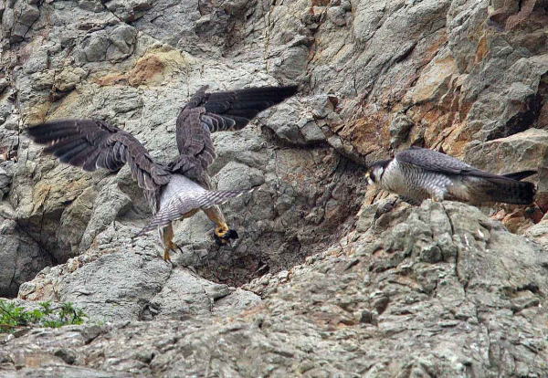 ![]() 右のオスがムクドリを岩の上に置きました。 メスが待機していた別の岩棚から駆けつけました。 |