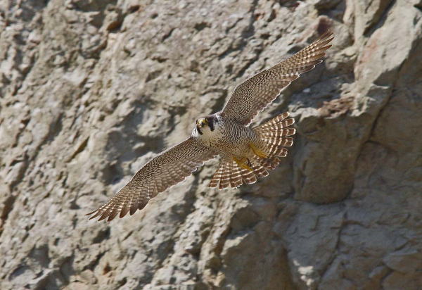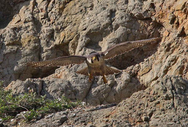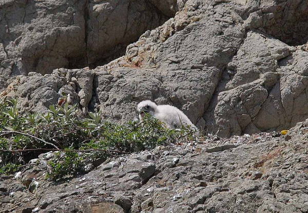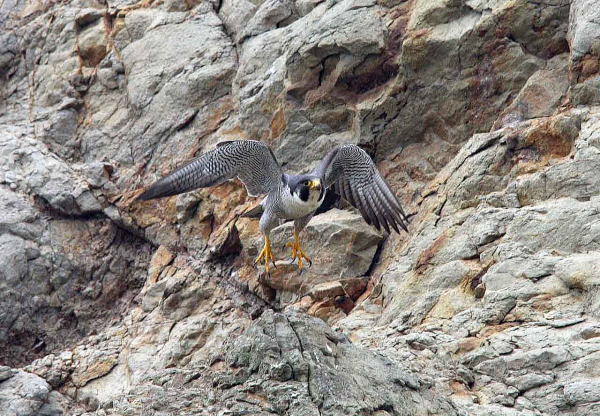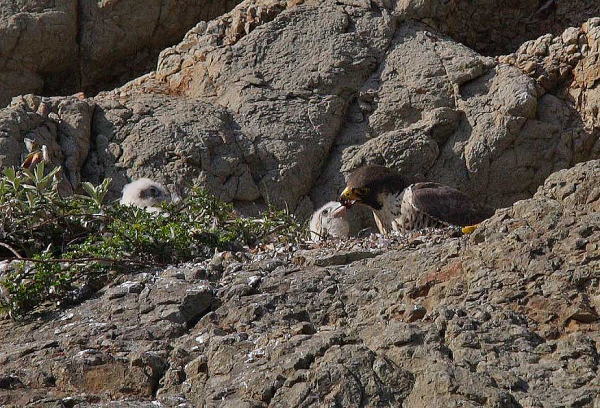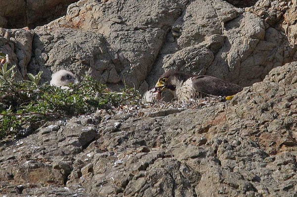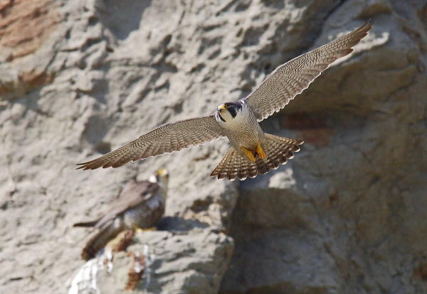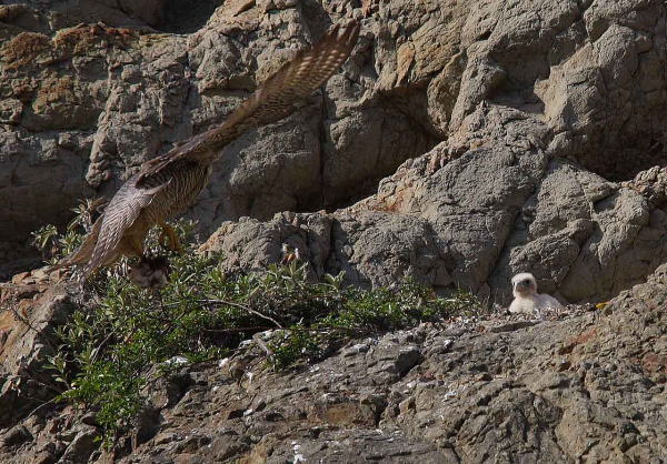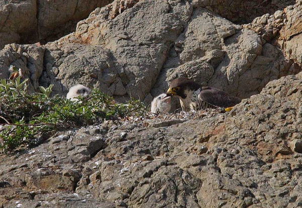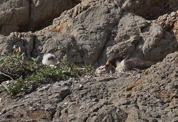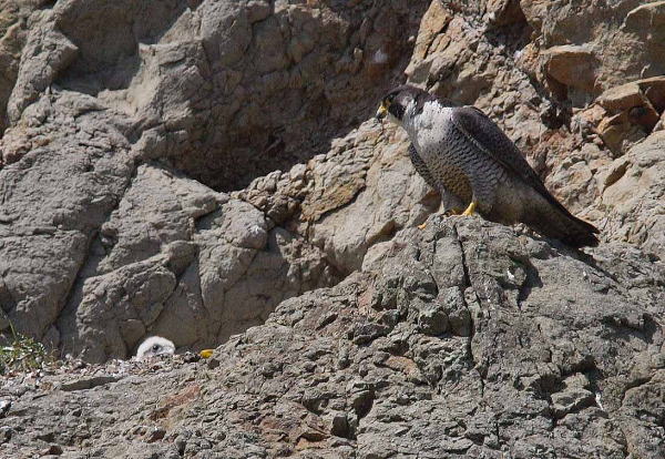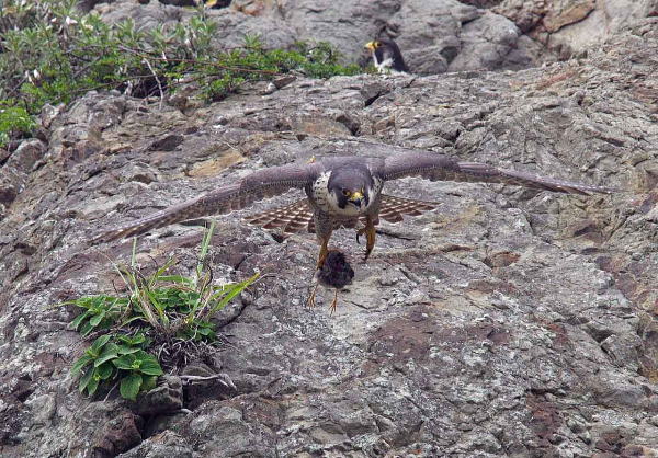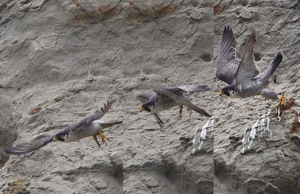 ![]() 右のオスがムクドリを岩の上に置きました。 メスが待機していた別の岩棚から駆けつけました。 |
