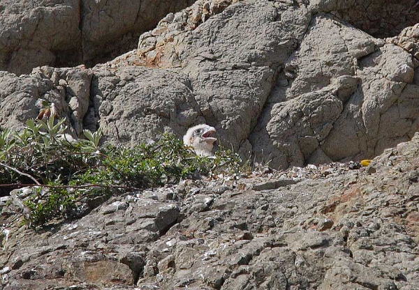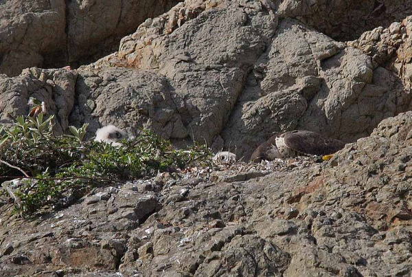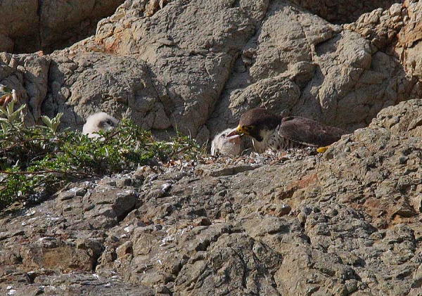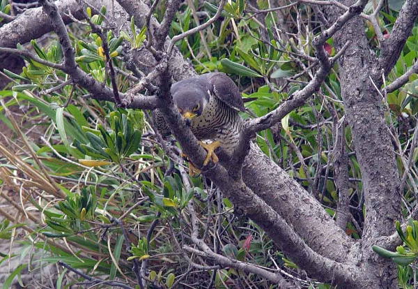 ![]() ムクドリを引き千切ってます。 ヒナが2羽見えますが、もう1羽計3羽いるようです。最も小さな1羽はこのメスの陰にいます。 ちょっと頭が見えただけで、カメラに収めることは出来ませんでした。 |