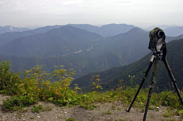 聞き、どこがポイントかわからないまま避暑を兼ねて車で登ってみました。 幸運にも白レンズ3本をすぐに発見、聞くとやはりイヌワシ狙いとのことで10分ほど前にも上空を飛んだとのこと(残念!)。 すぐに近くに機材をセットし待つことにしました。
