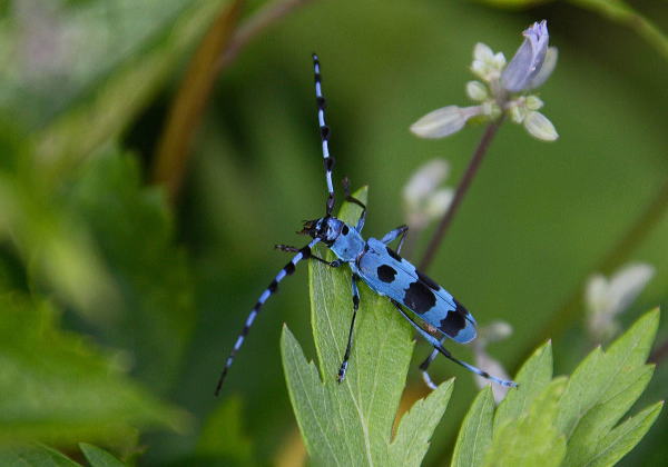後でインターネットで調べたら、ルリボシカミキリという名前でした。 初めて見ました。