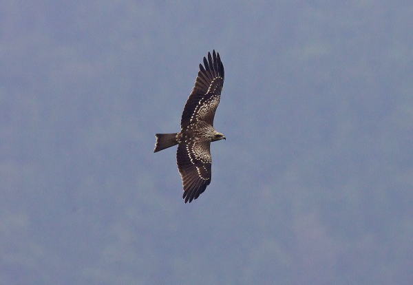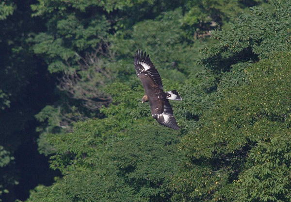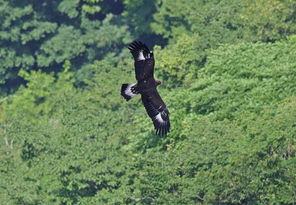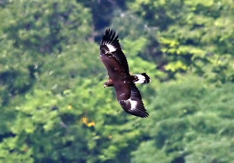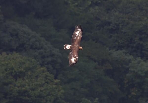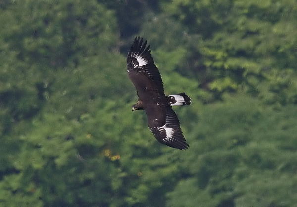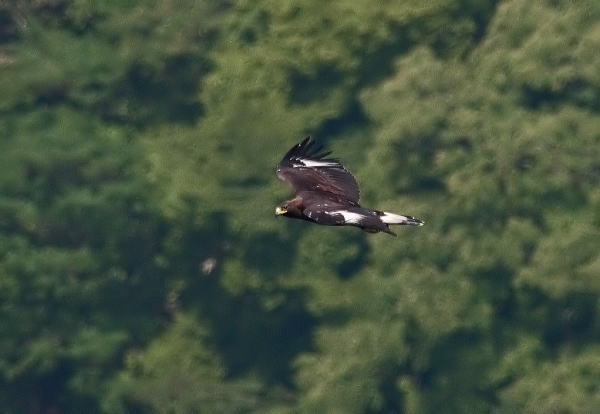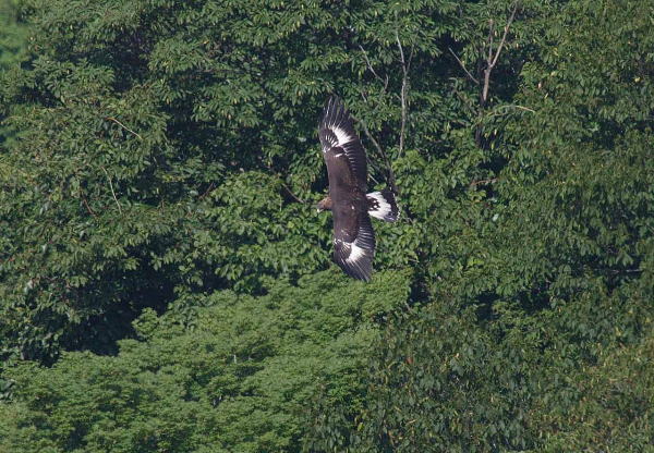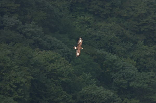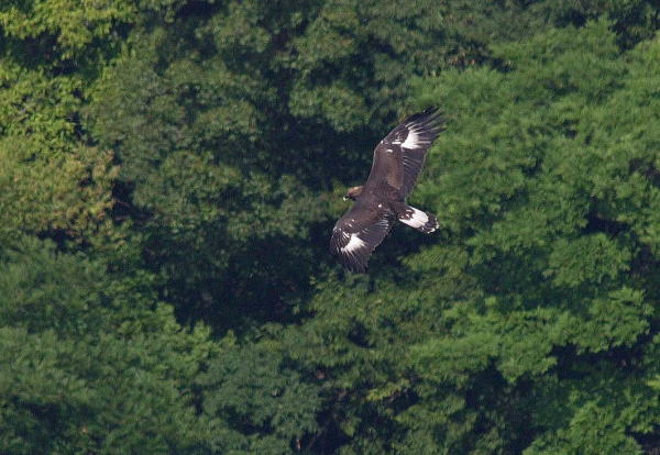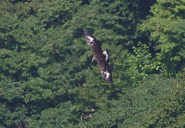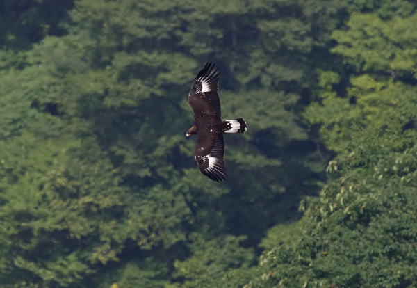 到着後、5時間経ち、もう諦めて帰ろうかと思っていたところに、前の谷の低い所を旋回しているイヌワシを発見。